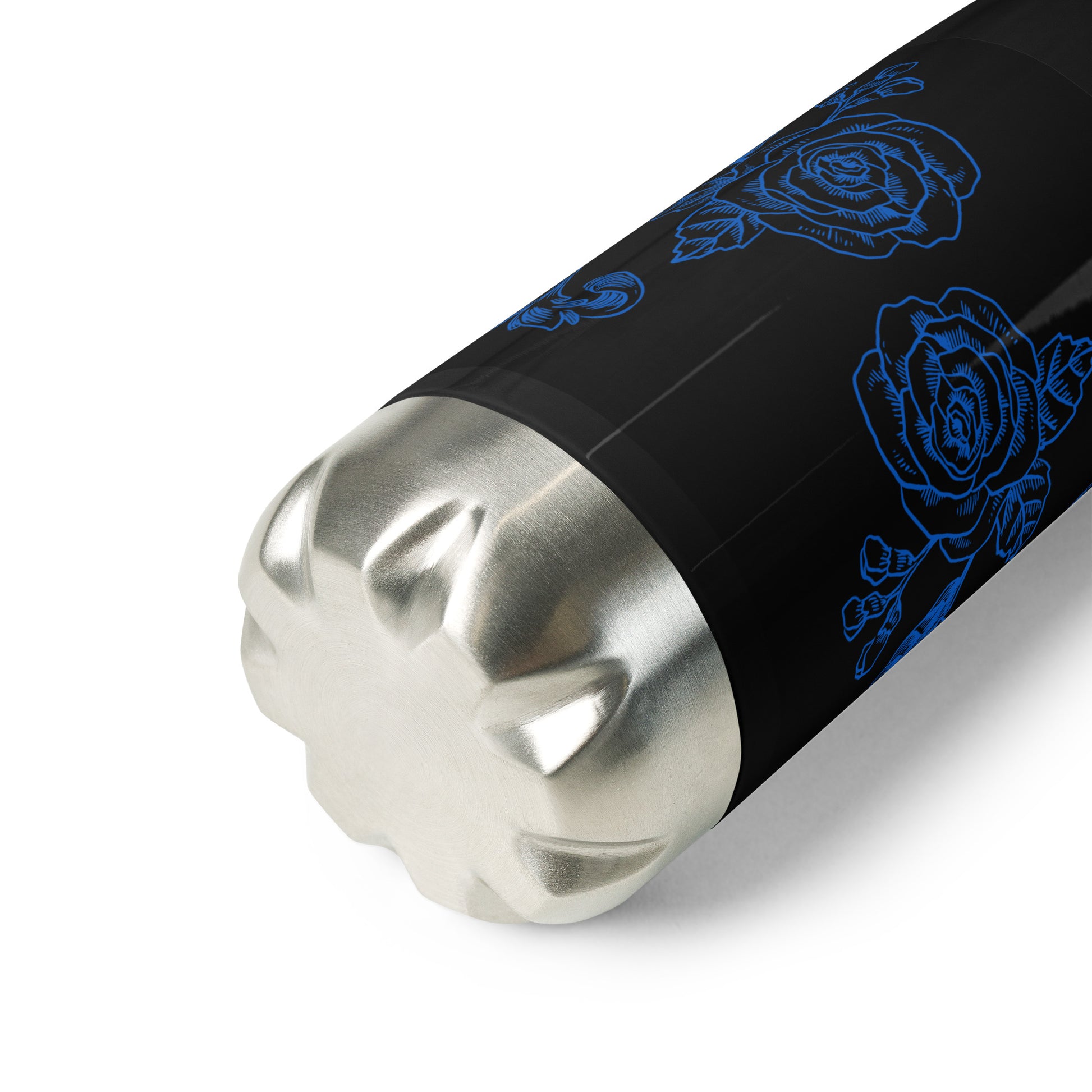 Black Stainless Steel Water Bottle Deep Blue Flower Filigree