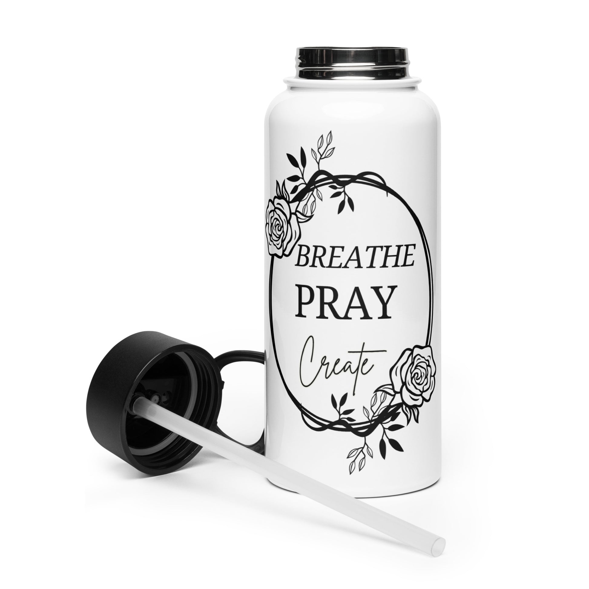 Breathe Pray Create Black Design White Stainless Steel Water Bottle with a Straw Lid 32 oz