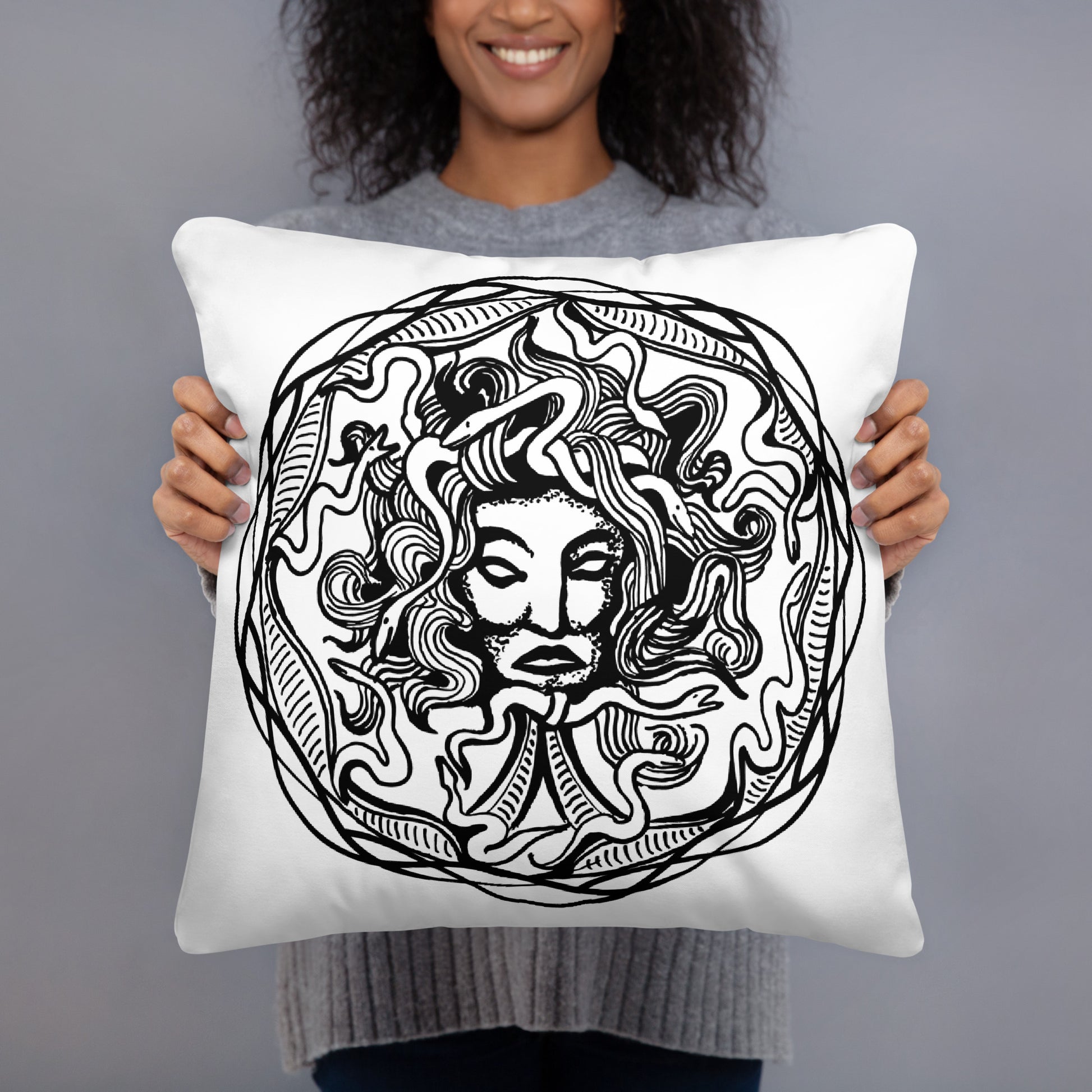 Medusa Circle Emblem Design White Throw Pillow 18" x 18" Square Pillow