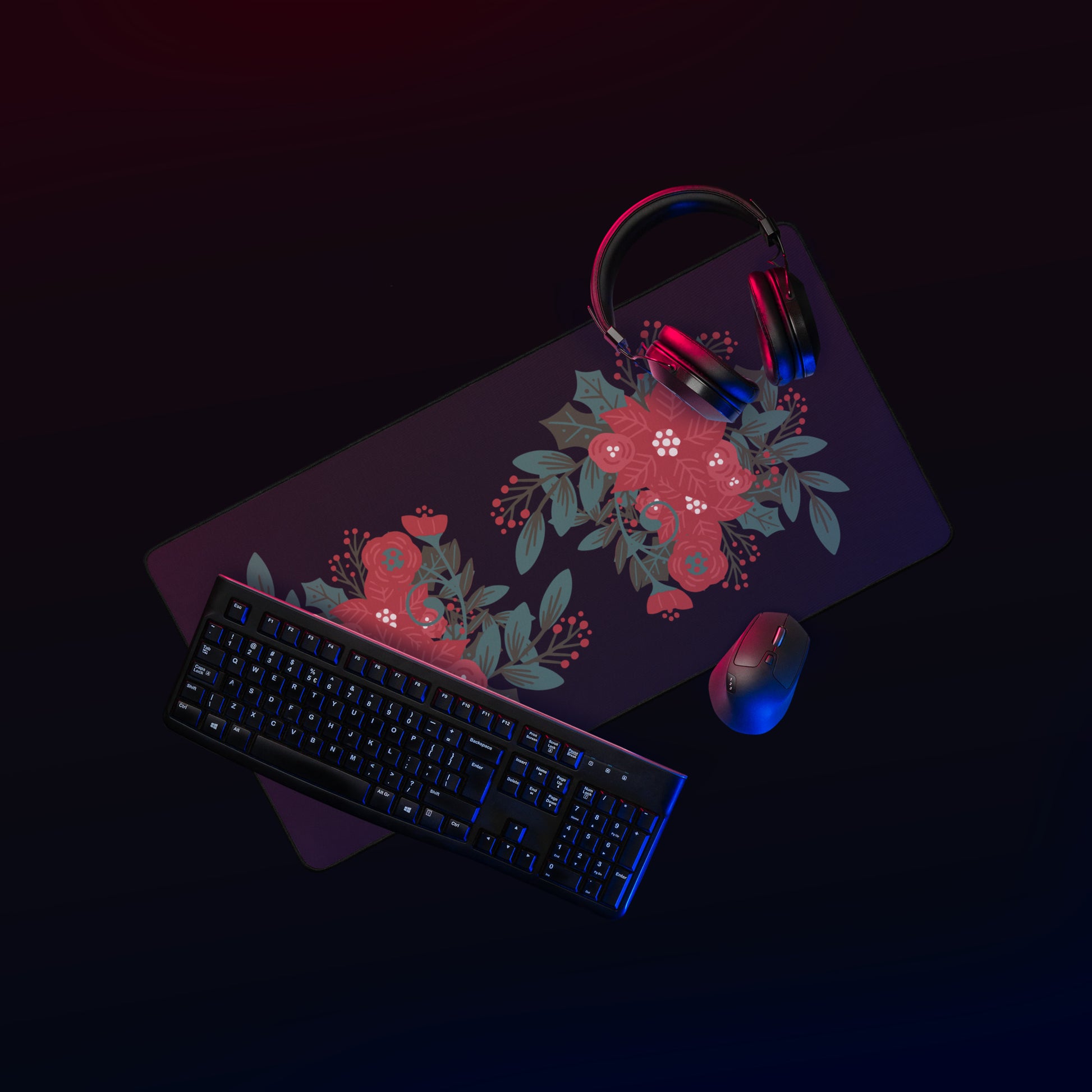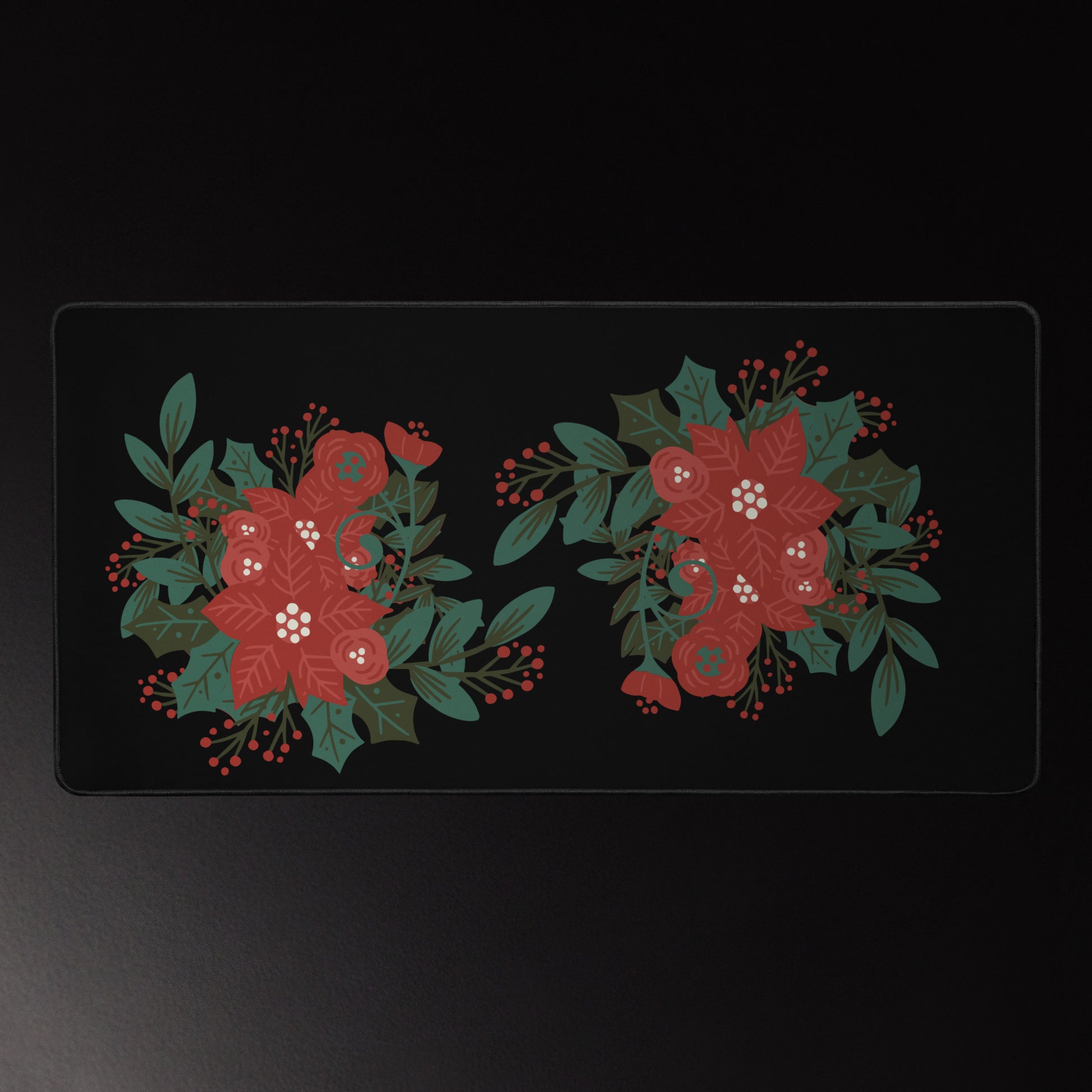 Poinsettia Holly Berry Black Desk Mat 16″×32″