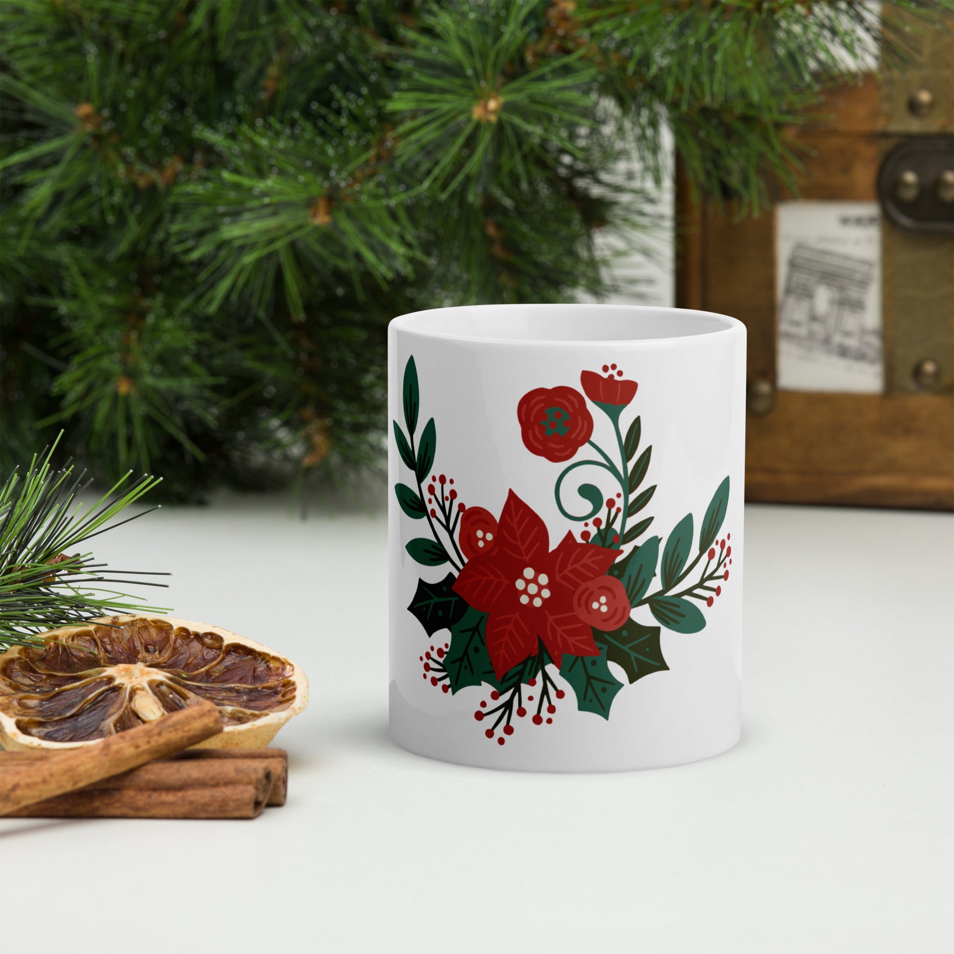 Poinsettia Holly Berry White Glossy Mug 11 oz
