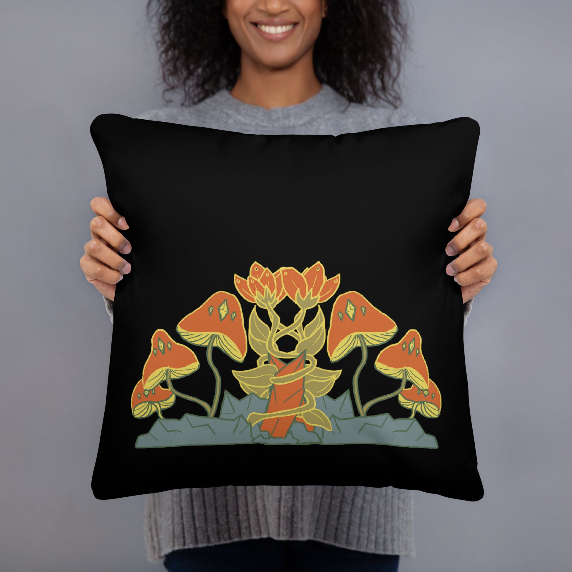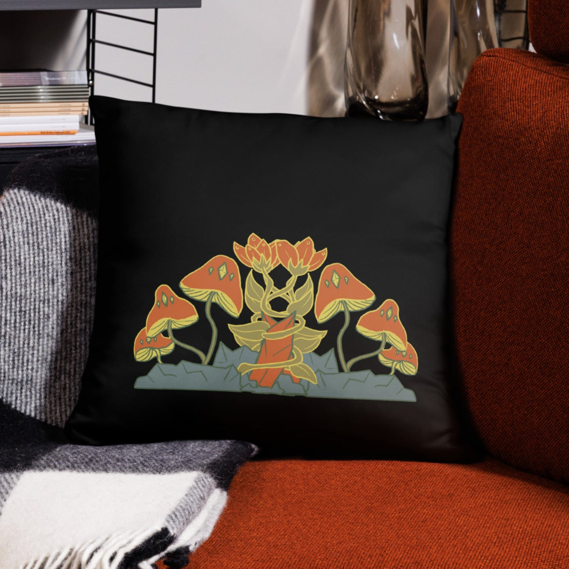 Retro Style Mushrooms Flowers Crystal Black Throw Pillow 18" x 18" Square Pillow