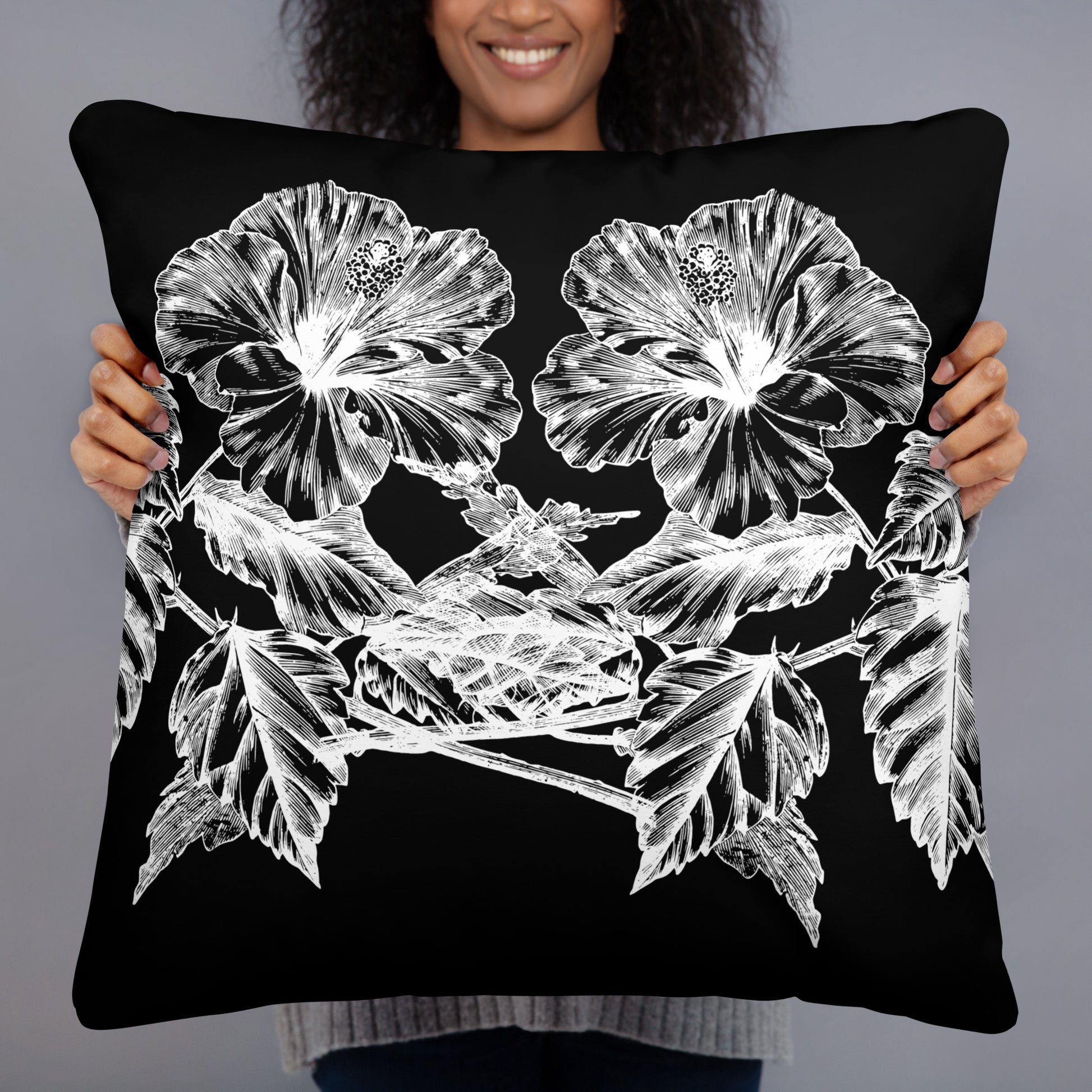 White Flowers Black Throw Pillow 22" x 22"